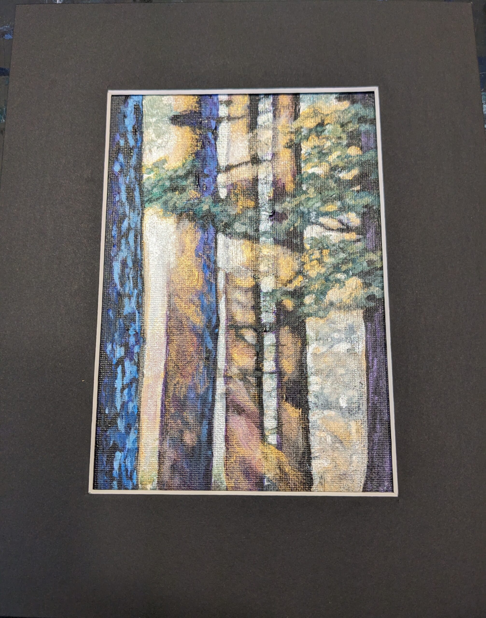 Light streaming through the trees. Acrylic on canvas with matting. 8″x10″