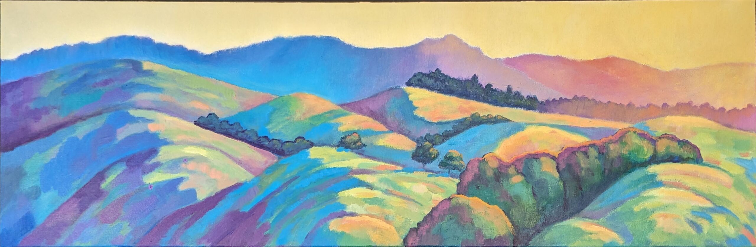 Bright and vibrant hills alive with light and color. Acrylic on canvas. 12″ x 36