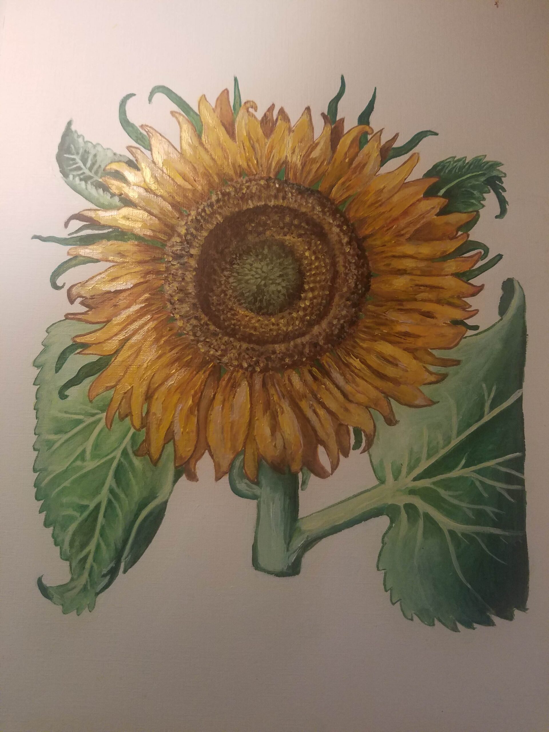 Vintage sunflower in metallic gold and bronze. Acrylic on canvas paper. 16″ x 20″
